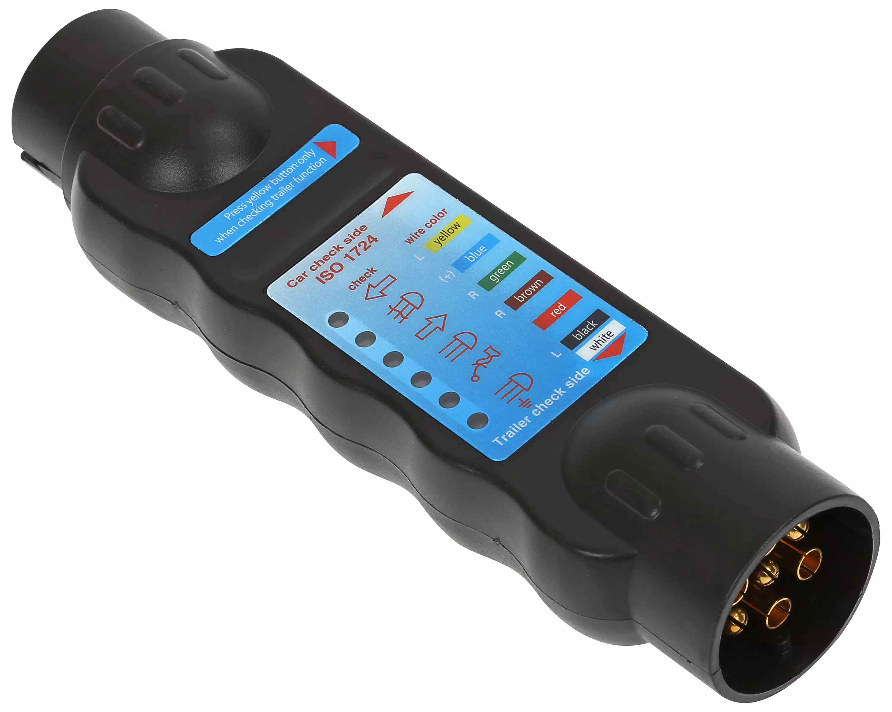- soveltuu sekä ajoneuvon pistorasian että peräkärryn pistokkeen testaamiseen, helpottaen vianetsintää ja vikojen, kuten rikkinäisten lamppujen, katkenneiden johtojen tai huonojen liitosten paikantamista