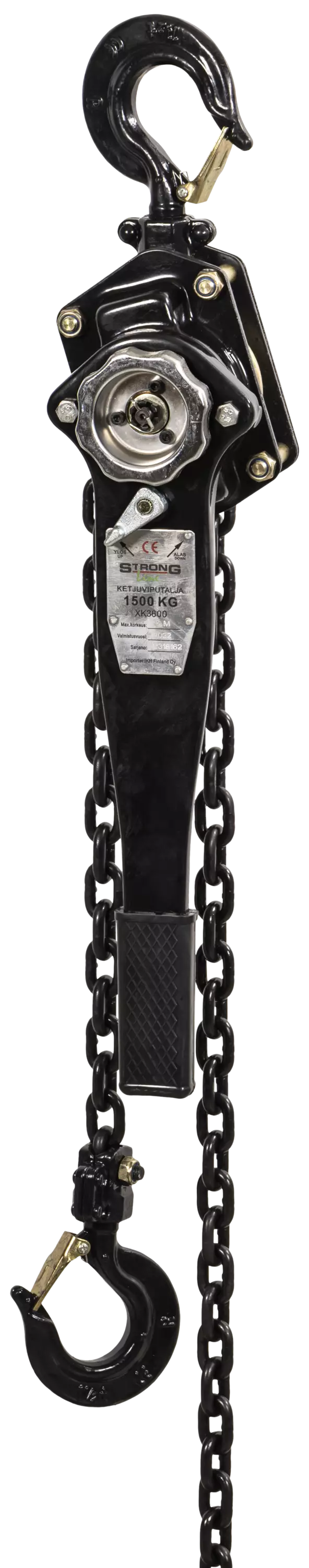 nostoteho 1500 kg nostovara 3 m ketjun vahvuus 8 mm käsikahvan pituus 410 mm nostokoukun kita 35 mm min. pituus 380 mm paino 11 kg Pakkauksen pituus (cm) 51.5 Pakkauksen leveys (cm) 15 Pakkauksen... Lue lisää