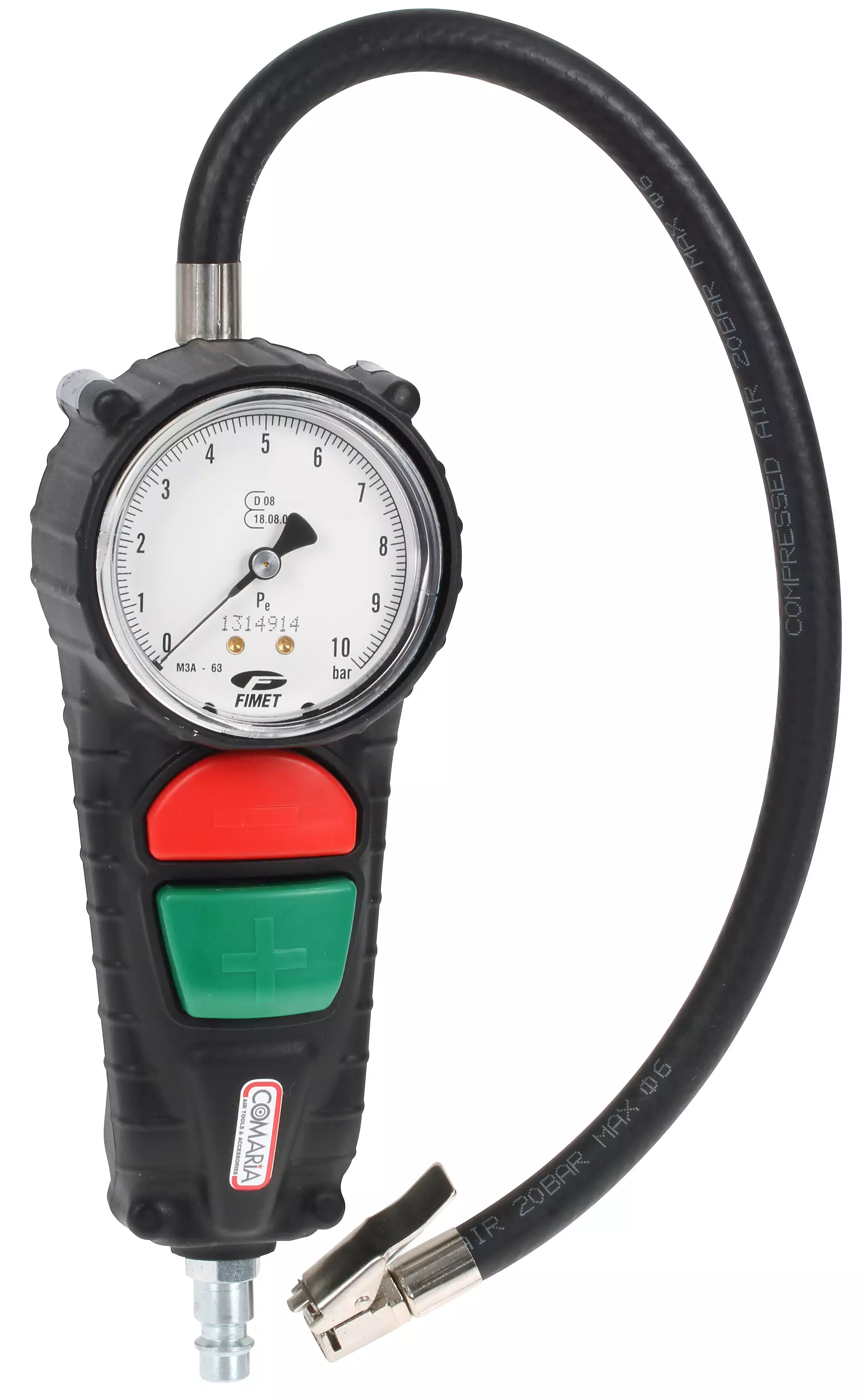 mittausalue 0-12 bar (0-180 psi) työskentelypaine max. 10 bar (145 psi) ilmaliitin 1/4" uros painemittarin Ø 50 mm letku 40 cm ilmantäyttöön, ylipaineen vapauttamiseen ja paineen mittaukseen... Lue lisää