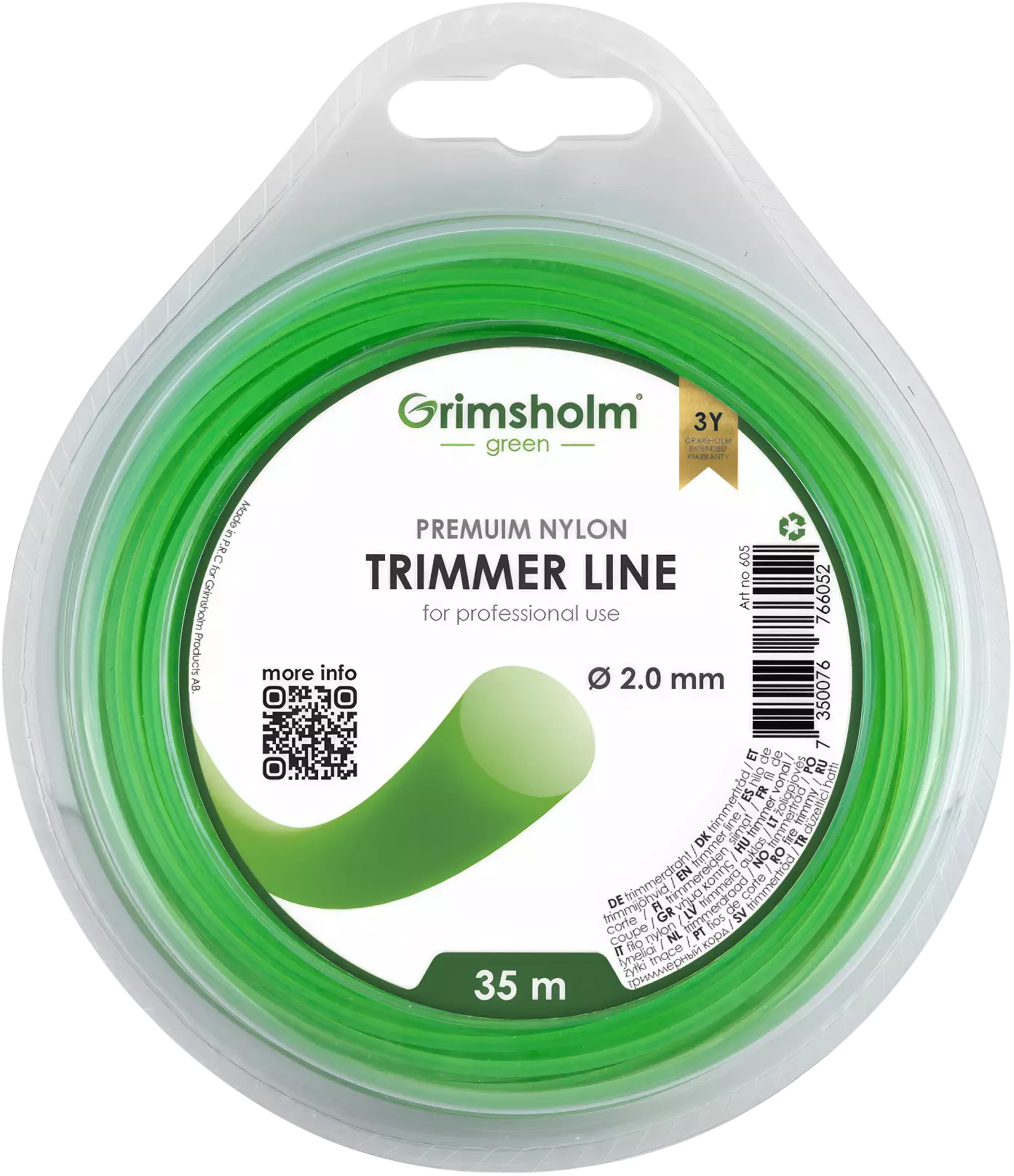 - Grimsholm®-trimmerisiima on valmistettu korkealaatuisesta nailonista, jonka ominaisuudet on optimoitu kestävyyttä ja hiljaista toimintaa varten