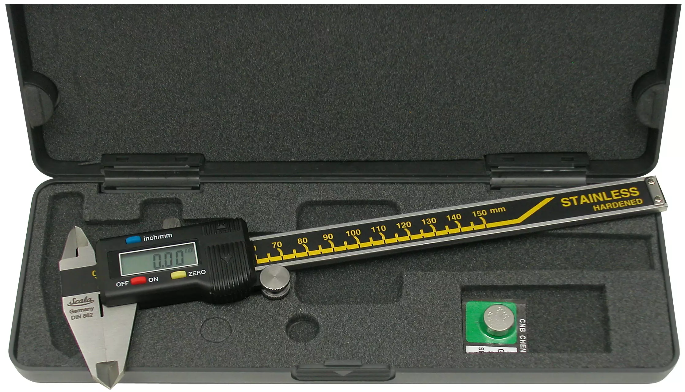 DIN 862 Sisä-, ulko- ja syvyysmittaukseen Ruostumaton teräs Leukojen ruuvilukitus Valittavissa mm- tai tuumanäyttö Nollauspainike Mittauspituus 150 mm, leukojen korkeus 40 mm Mittaustarkkuus 0,01... Lue lisää