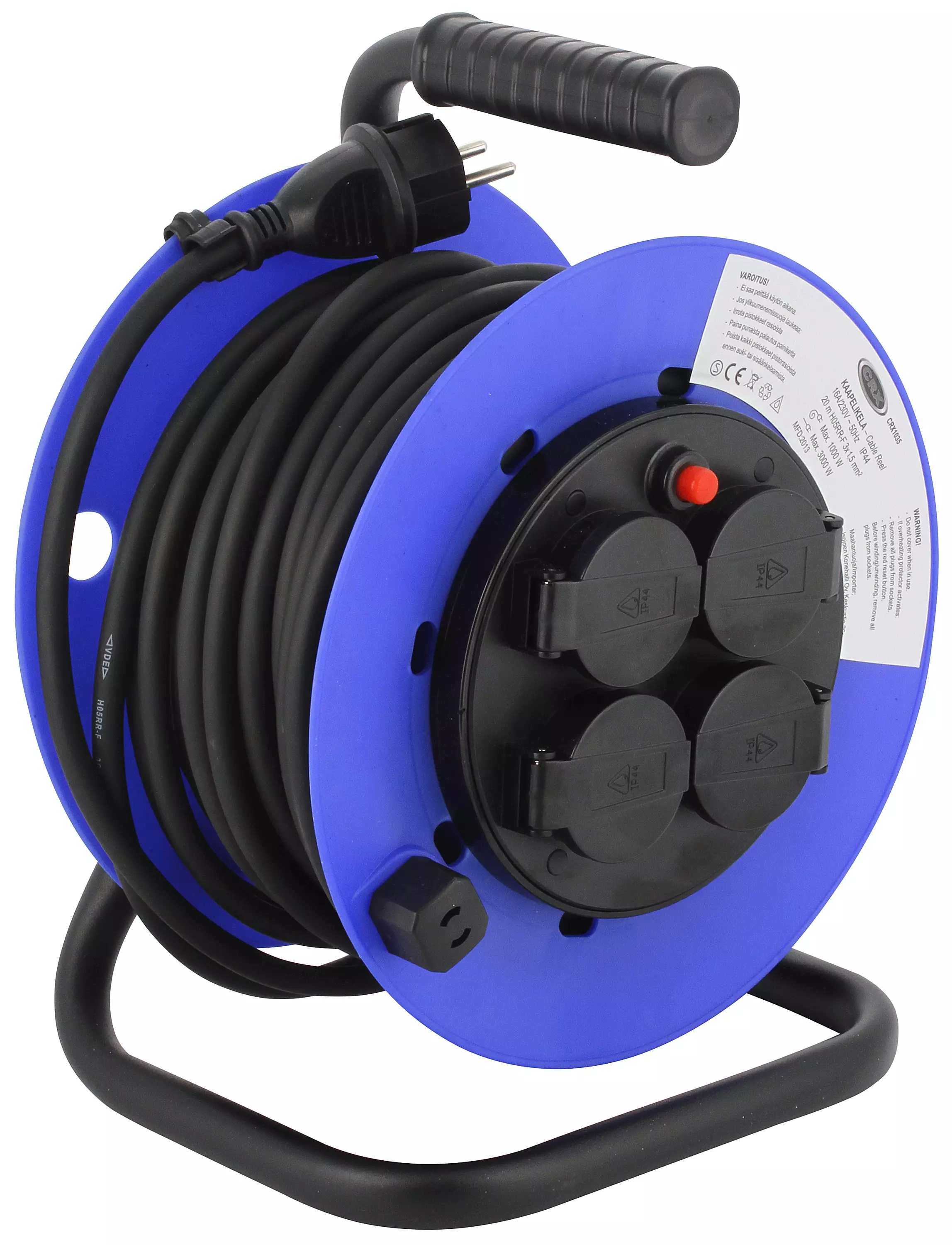 kumikaapeli 20 m (H05RR-F 3x1,5 mm²) max. kuormitus kelalla 1000 W, kelalta purettuna 3000 W varustettu ylikuumenemissuojalla neljä maadoitettua, roiskevesisuojattua pistorasiaa itsesulkeutuvilla... Lue lisää